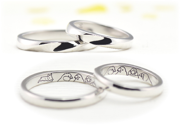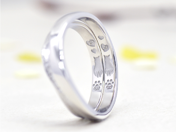 飼われている猫、4匹を結婚指輪の表面にデザイン。ご趣味のギターで奏でた音色の中で楽しむ遊び回る様子をご提案させていただきました。